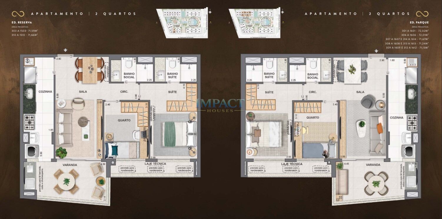 As plantas são inteligentes, com possibilidade de personalização. São unidades de 2 quartos (70 m²), 3 quartos (90 m²), 4 quartos (118 a 131 m²), além de gardens, coberturas duplex e lineares — o que atende diferentes perfis e momentos de vida.