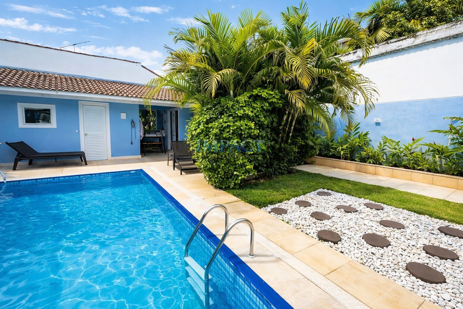Jardim com paisagismo, espaço nos fundos, piscina, churrasqueira e edícula. Vaga para carros na frente da casa.