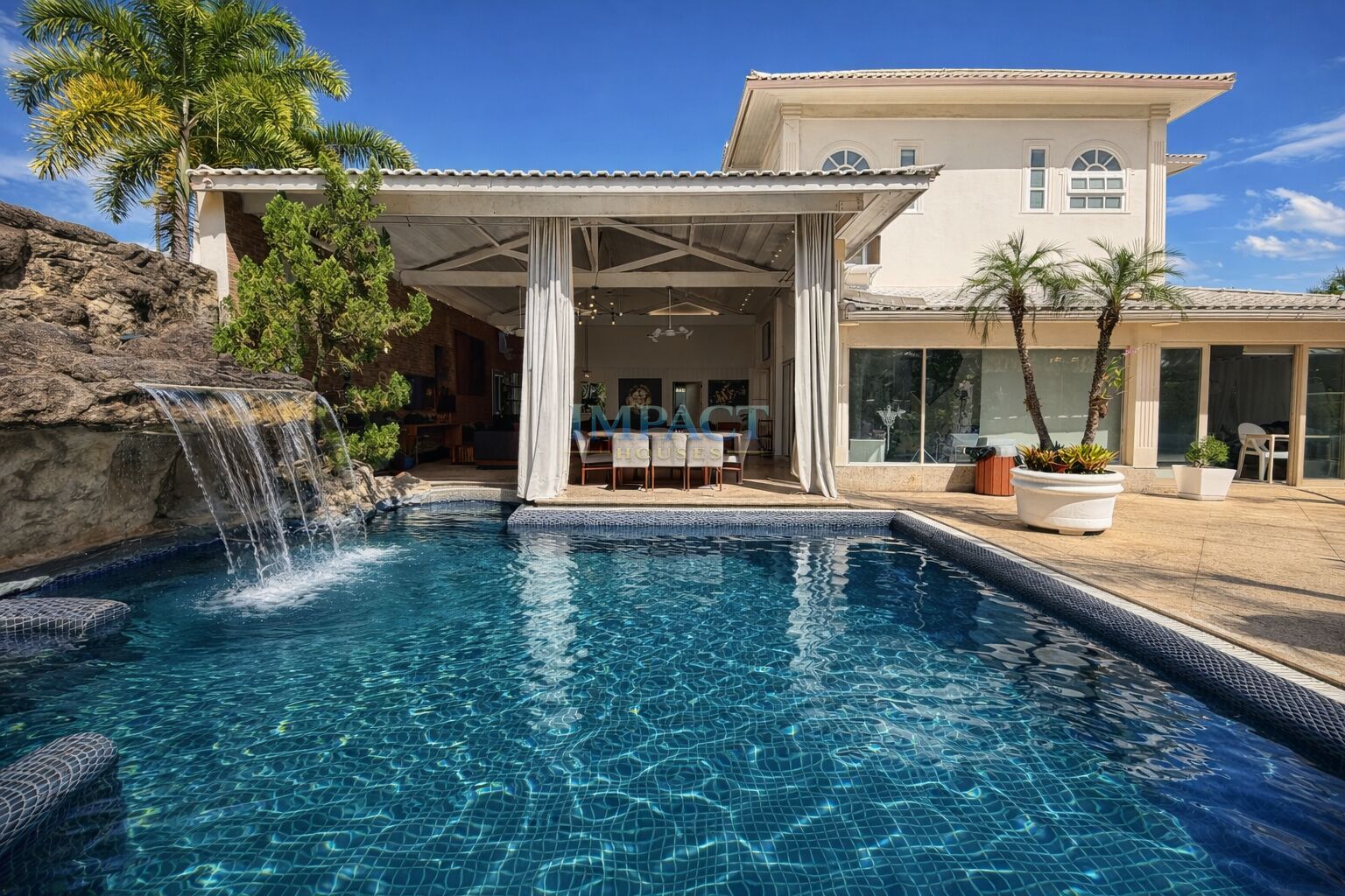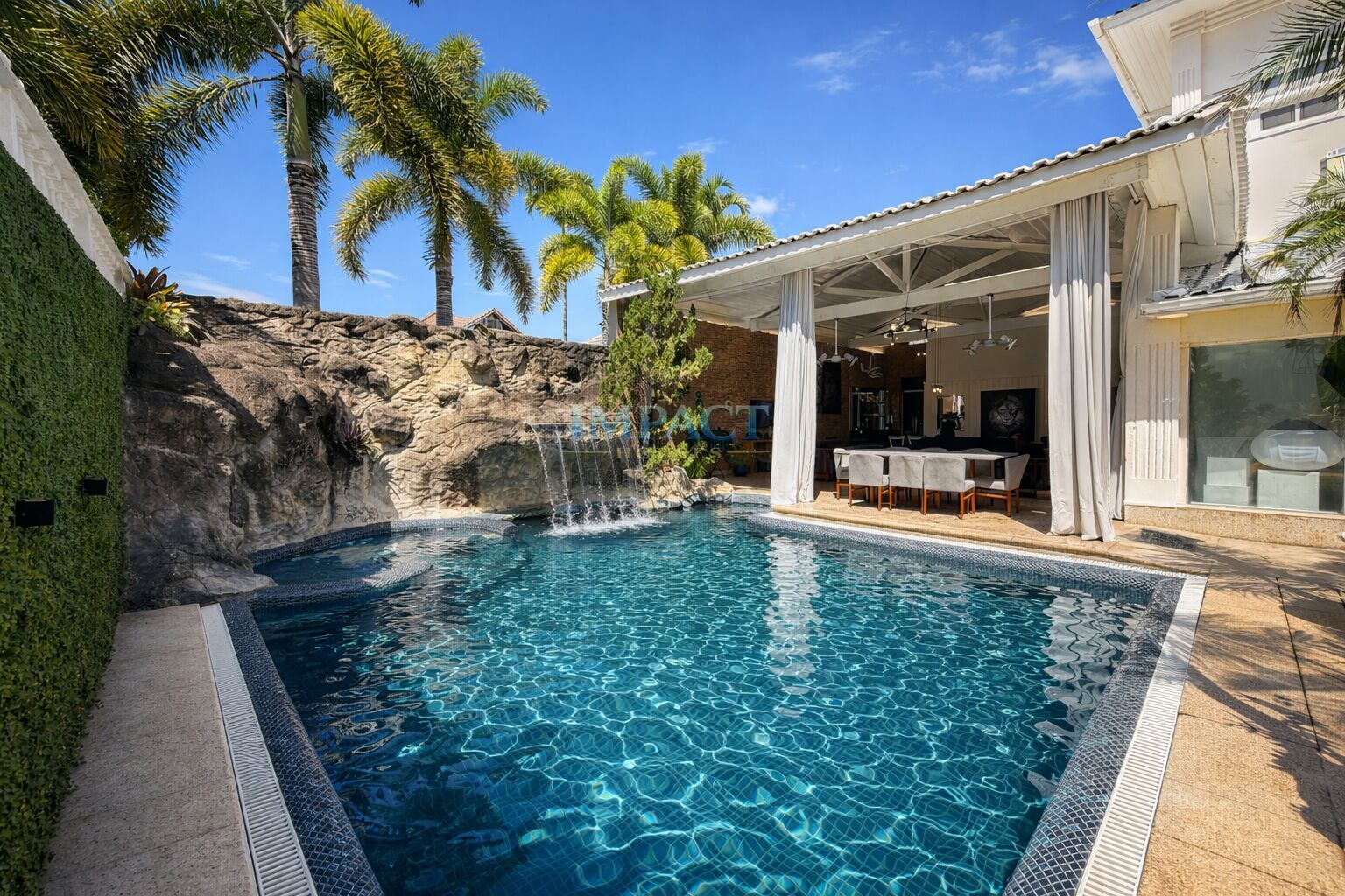 Piscina com cascata, parede de pedras e sistema de purificação sem cloro